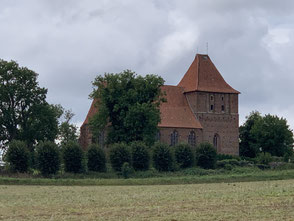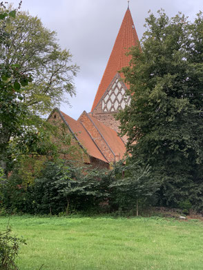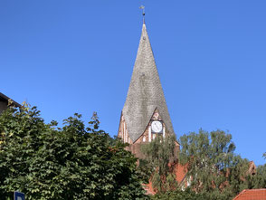 Eine kurze Rast in Neubukow. Die Kulisse wirkt einladend. Der Kirchturm vor stahlblauem Himmel.