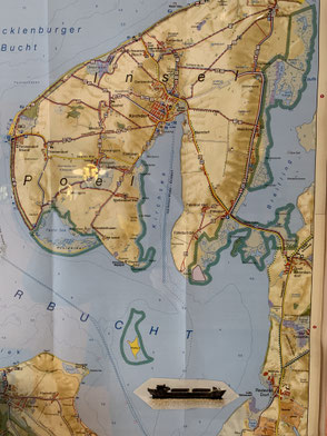Eine historische Karte der Insel Poel. Von Kirchdorf bringt uns die Fähre durch die Wismarer Bucht in den alten Hafen.