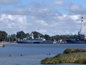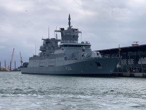 Bei der Rückkehr auf der Fähre erwartet uns völlig überraschend dieses graue Ungetüm im Hafen. Das Kriegsschiff F224, die Sachsen-Anhalt, wurde am 4. Juni 2014 in Zusammenarbeit zwischen ThyssenKrupp Marine Systems und der Lürssen-Werftgruppe in Hamburg auf Kiel gelegt. Die feierliche Taufe erfolgte am 4. März 2016 in Hamburg. Taufpatin war Gabriele Haseloff, die Ehefrau des Ministerpräsidenten von Sachsen-Anhalt, Reiner Haseloff.