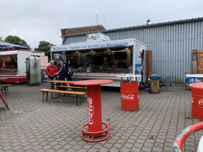 Abschluss Fischbrötchen mit Brathering. Woanders würde man Hinterhof und Müllhalde sagen, hier ist es Kult. Deutsche Schlager laufen im Hintergrund. Es erinnert ein wenig an Apres Ski.