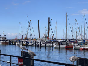 Der Yachthafen in Warnemünde. Blauer Himmel, Sonne pur und 29 Grad. Und das Ende August.